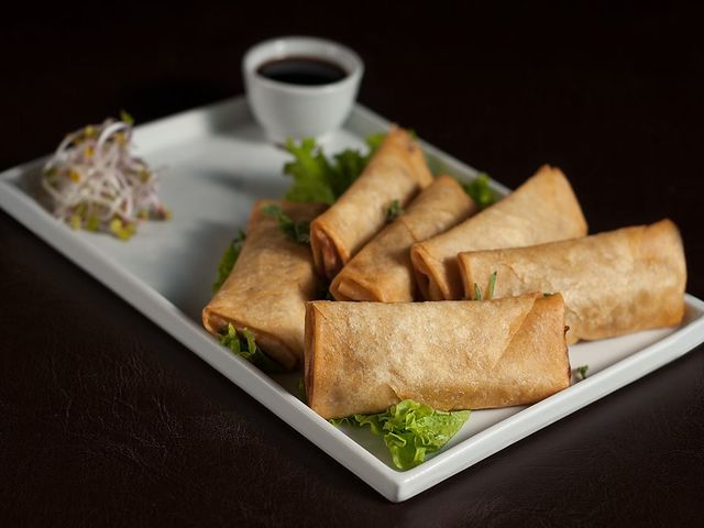 Empanaditas chinas rellenas de VERDURA. Vienen acompañadas de salsa agridulce. Ideales para acompañar tu combo Veggie DelSushi.